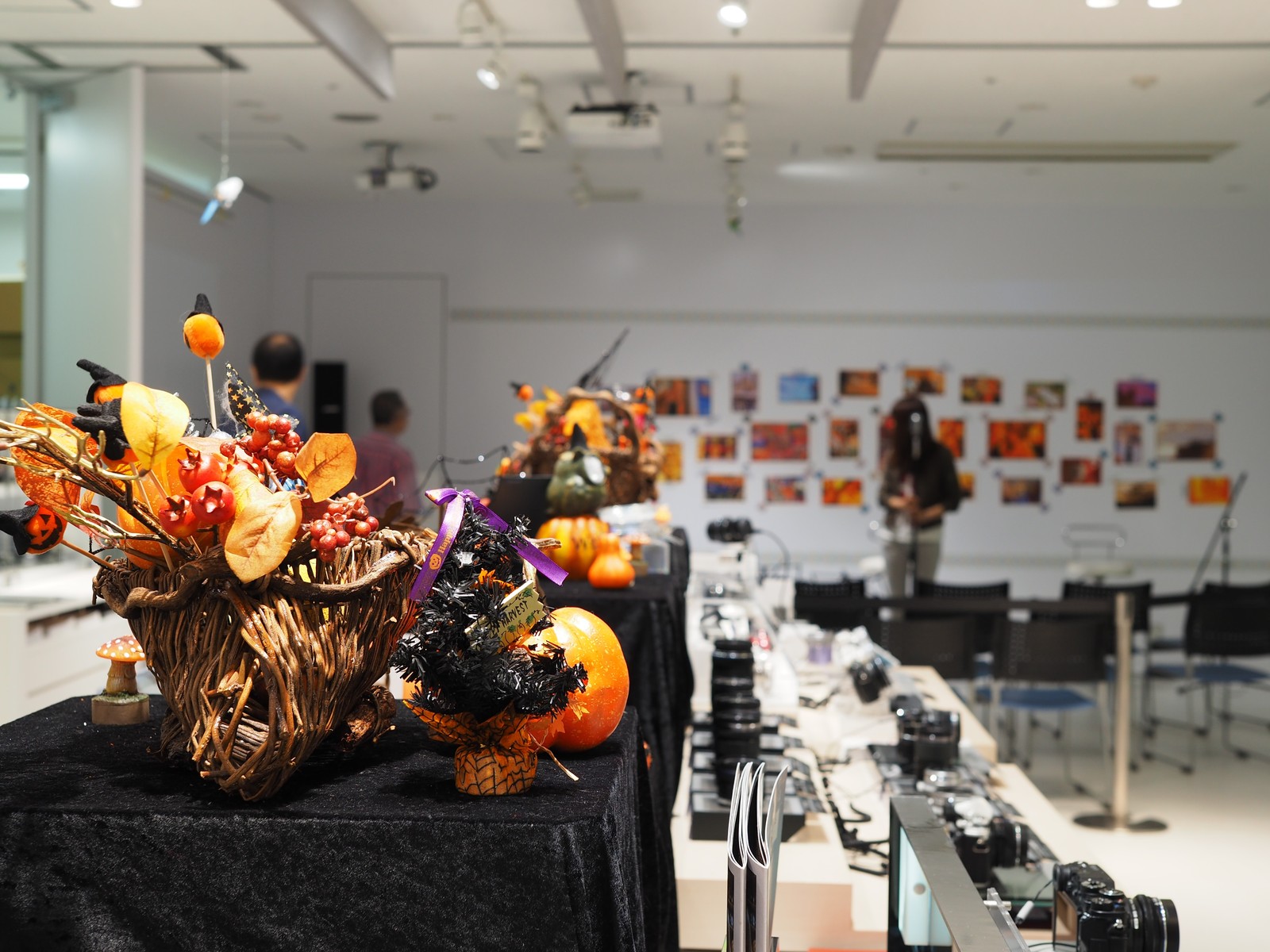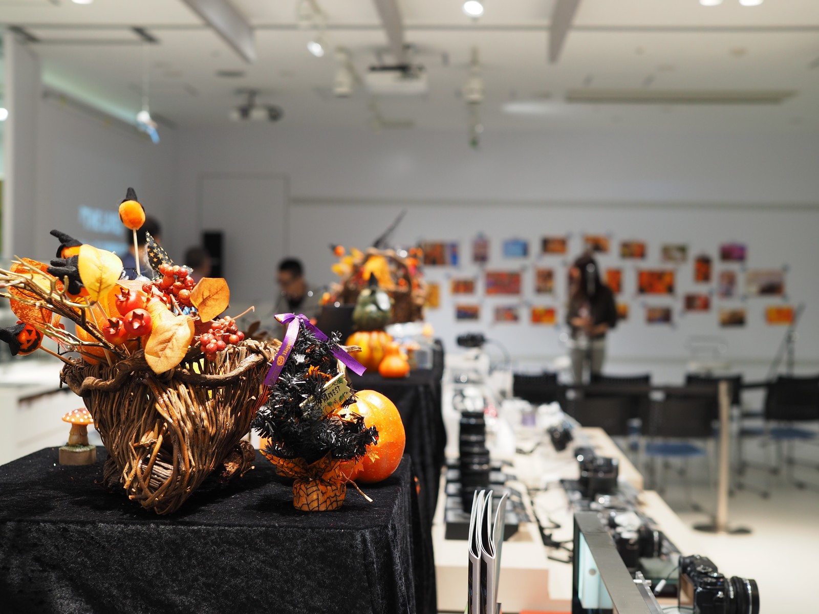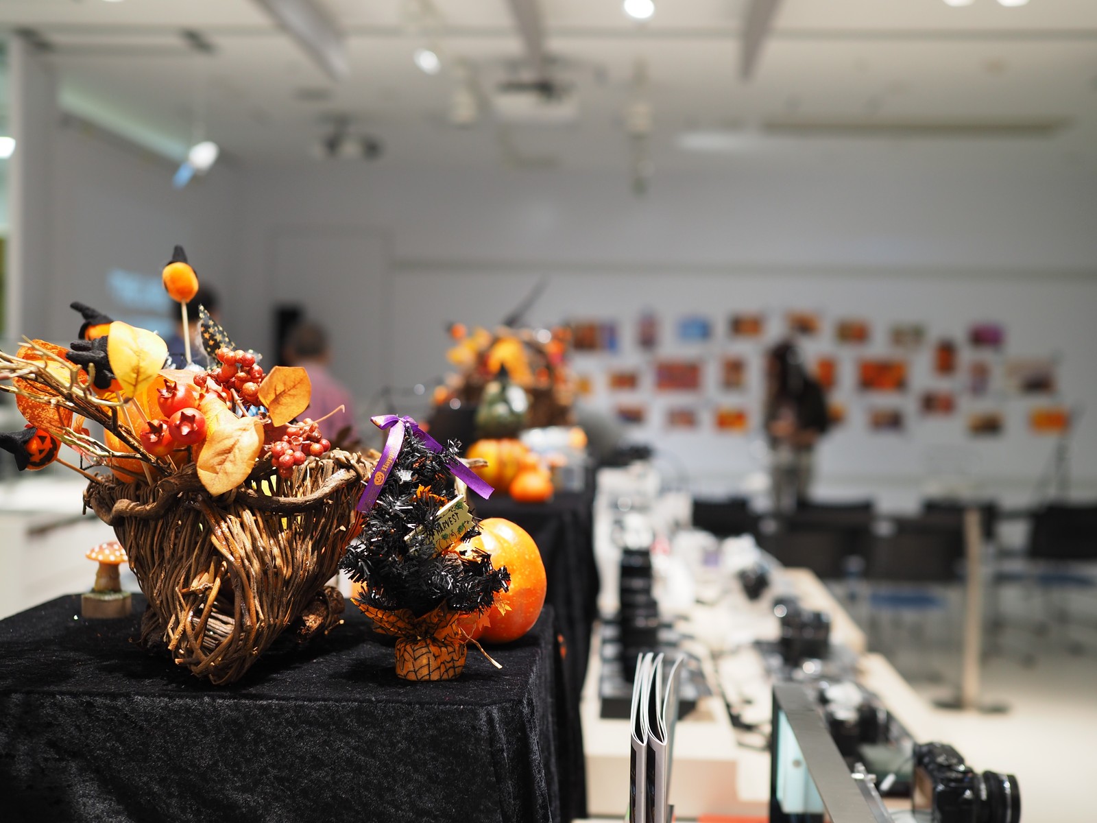 ピント位置は展示台上のハロウィンツリーのリボンで。