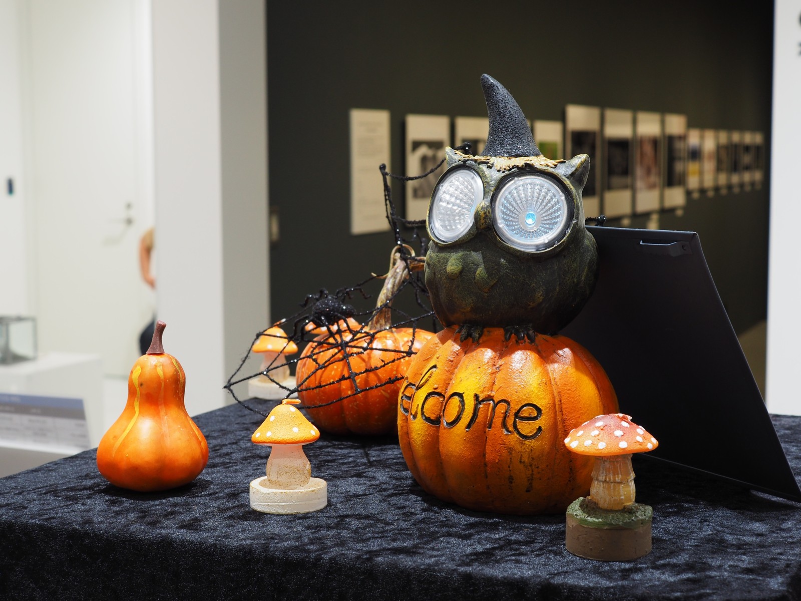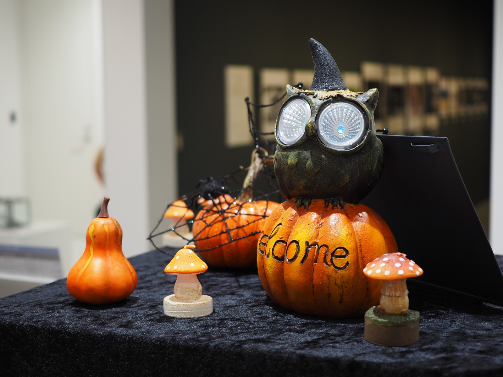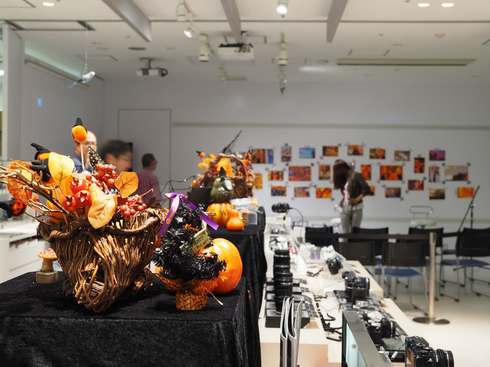 ピント位置は展示台上のハロウィンツリーのリボンで。