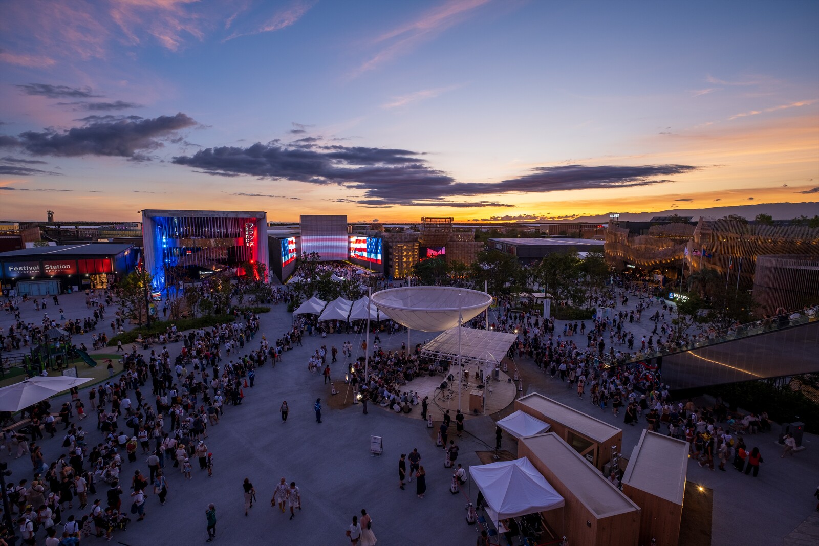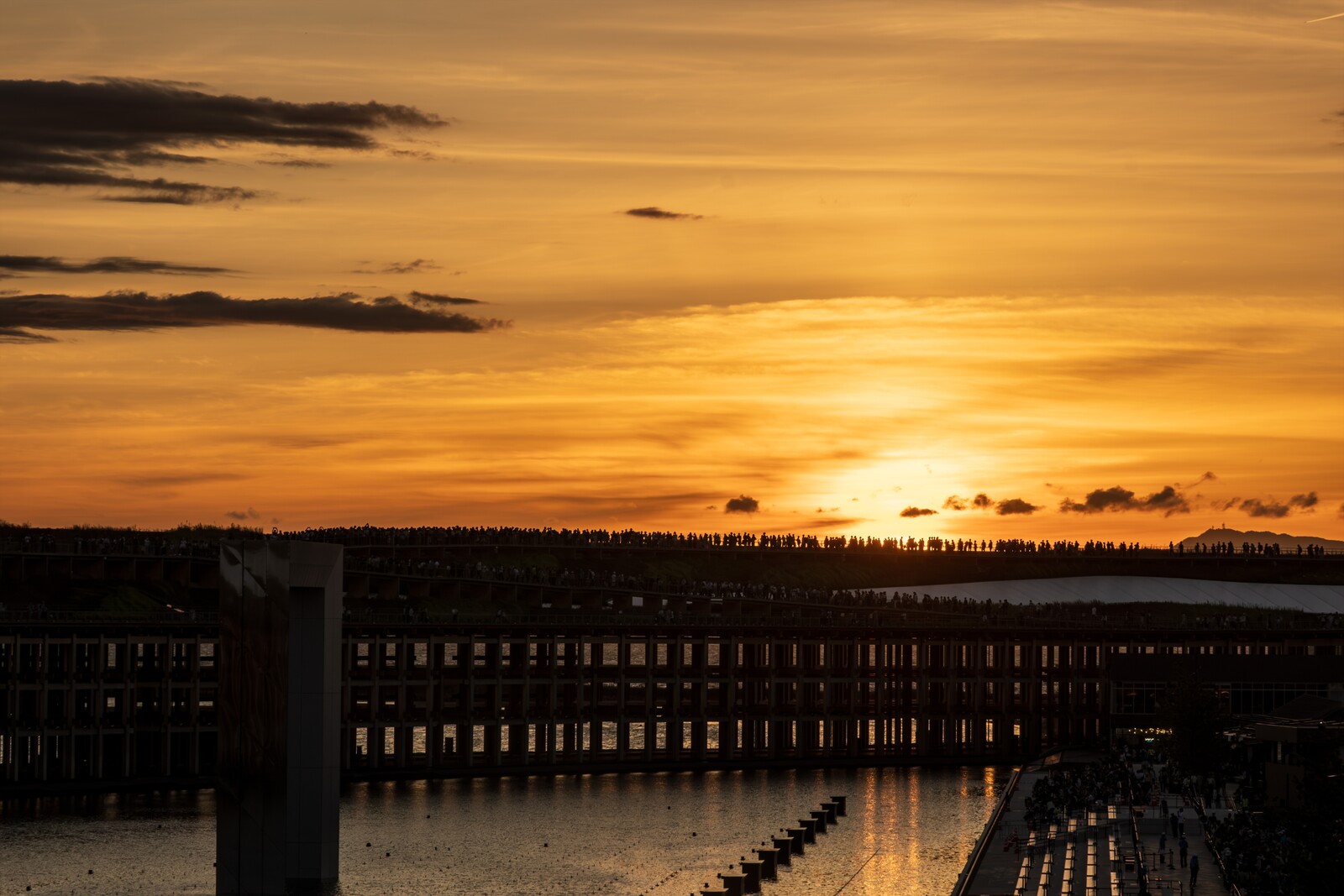 あれこれ考えたうえで陣取ったのは、大屋根リングの上、噴水とかをやる水辺越しの夕陽。