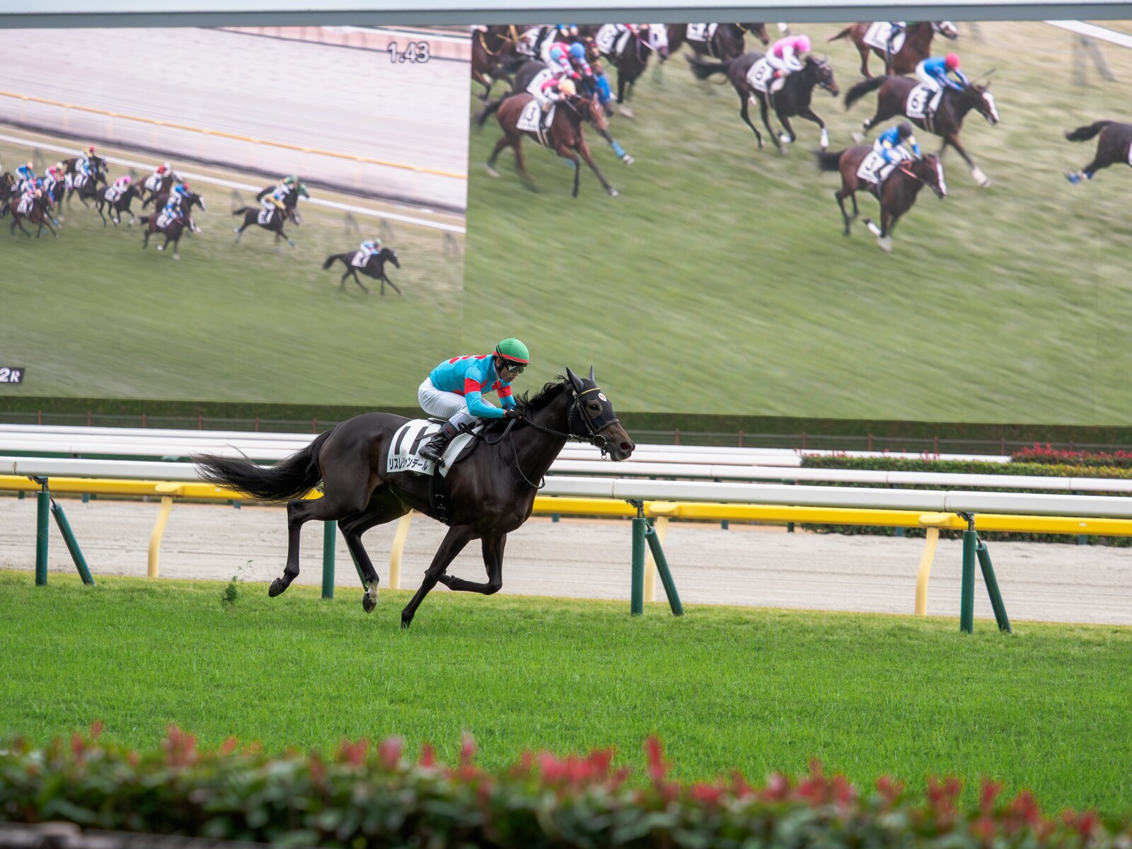 後ろの大型ビジョンを使って、飛び出した馬と、追う馬群の対比を撮りました。